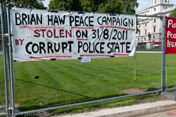 The permanent 24/7 peace protest in Parliament Square begun by the late Brian Haw more than ten years ago is continuing despite the campaign by police and politicians to bring it to an end. On 31 August, police came and removed the display despite the protests of the campaign members present at the site, saying that it had been abandoned despite their protestations. This was not the first time that the display here has been stolen by police, the most famous being in May 2006, after which a reconstruction by an artist was controversially put on display at Tate Britain.