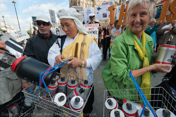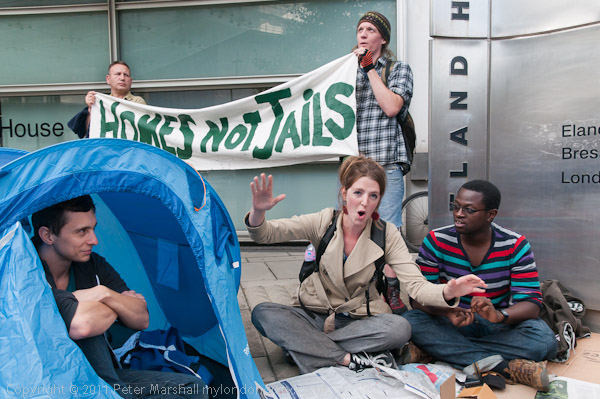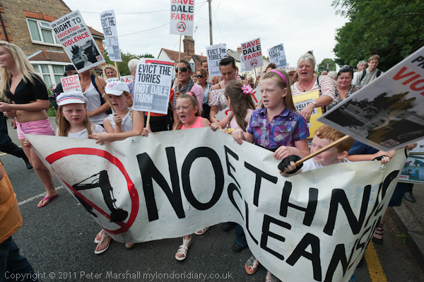 Many of the activists who might otherwise have come to the protest are already at Dale Farm in Camp Constant there, set up to oppose the bailiffs who are expected to come and evict them on September 19th. Yesterday there were rumours that the eviction was about to start earlier than the date previously leaked from Basildon Council, but nothing has yet happened. Many expect the bailiffs simply to deliver notice to the residents on the 19th when the activists will be ready for them and large numbers of press are expected to attend, and to return a few days later in the middle of the night to dismantle the defences and remove the activists before starting on evicting the protesters.