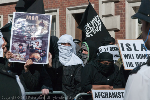 Although most of the protesters were from the left, socialists or anarchists, one well-known Muslim member of the English Defence League came up at the start to ask me and the other press what was happening and stopped to take part in the protest.