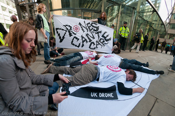 On the last day of the DSEi Arms Fair in London Docklands, East London Against Arms Fairs processed around Royal Victoria Dock and floated a wreath for victims of the arms trade in the dock opposite the fair.