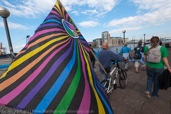 The funereal procession made its way slowly around the dock side, led by woman carrying a wreath followed the East London Against Arms Fairs (ELAAF) banner and small group with other banners and flags, with the rear being brought up by six policemen.