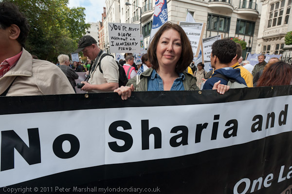 The letter, which should be available on the web shortly, demanded that the British government takes action to ensure that everyone in Britain came under the same law, and that there should be no Sharia courts (or other religious courts) in this country. Before the election, David Cameron had expressed his agreement with this but in power had done nothing about it. This is the latest in a series of similar letters delivered by previous marches, and the civil servants who had replied to these had failed to answer any of the points in them.