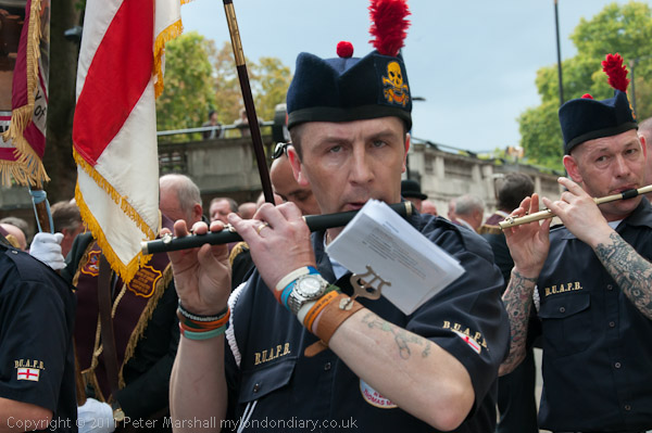 The parade seemed to be rather smaller than in some previous years with fewer visiting groups taking part. Among those marching with the City of London Campsie Club were the Westminster Campsie Club, the London Somme Association, their banner commemorating the actions of the 36th Ulster Division in the First World War, The British Ulster Alliance, Corby Loyalists and the Rising Sons of William Flute Band from Cormeen in Northern Ireland.