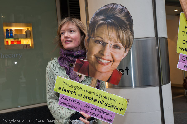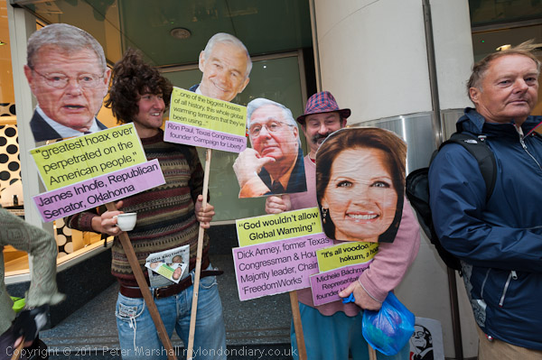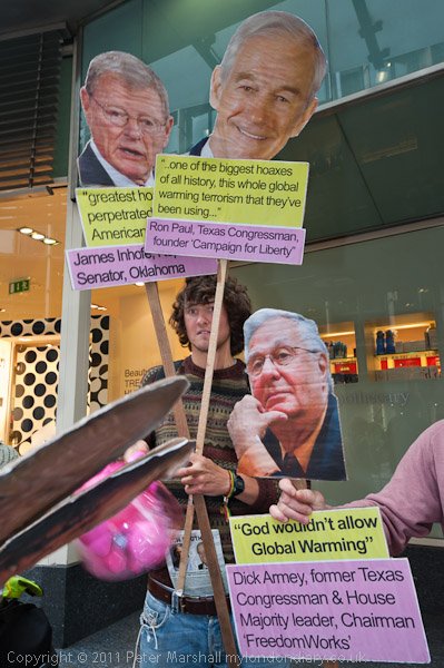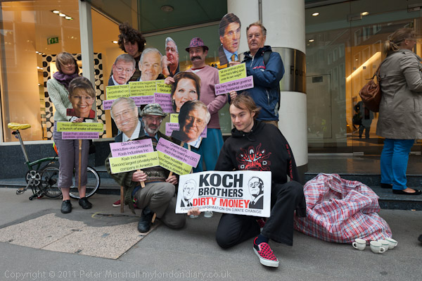 Phil Thornhill of Campaign against Climate Change with the Koch Brothers placards