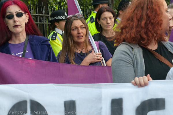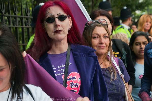 Protesters gathered at Temple, many wearing purple, the traditional colour of the anti-vivsection movement