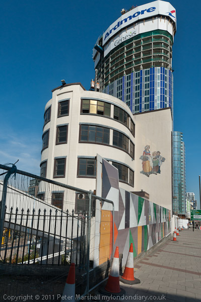 The Yardley mural dwarfed by a huge black behind; fences still bar this section of the Greenway making a detour necessary