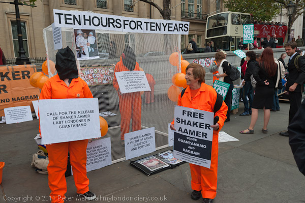 A cage held a 'Tony Blair' figure and orange clad protesters called for Shaker Aamer to be let out of Guantanamo
