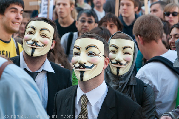 Some wore the 'Guy Fawkes' masks of 'Anonymous'