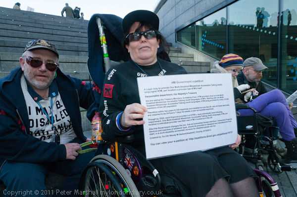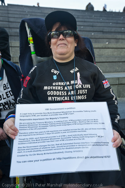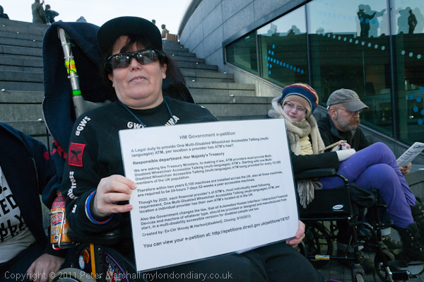 ![]() ![]() This woman had come with a long placard about an e-petition ![]() calling for Disabled Wheelchair Accesible Talking (multi-language) ATMs ![]() to be provided at all locations where providers have their own ATMs installed ![]() It is at http://epetitions.direct.gov.uk/petitions/18707 |