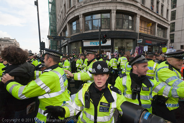I was kicked in the leg as the police grabbed some of the protesters, only a minor injury but painful