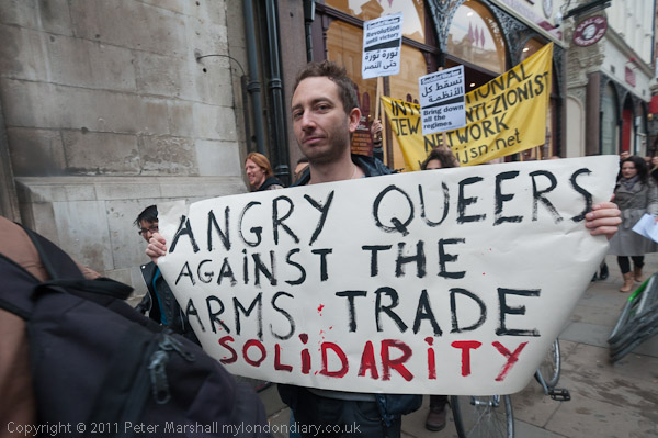 One man carried the 'Angry Queers Against the Arms Trade poster