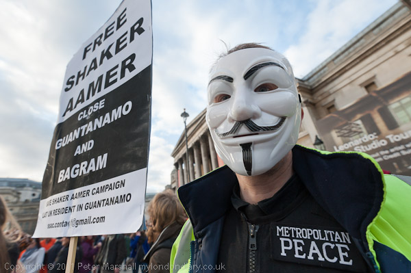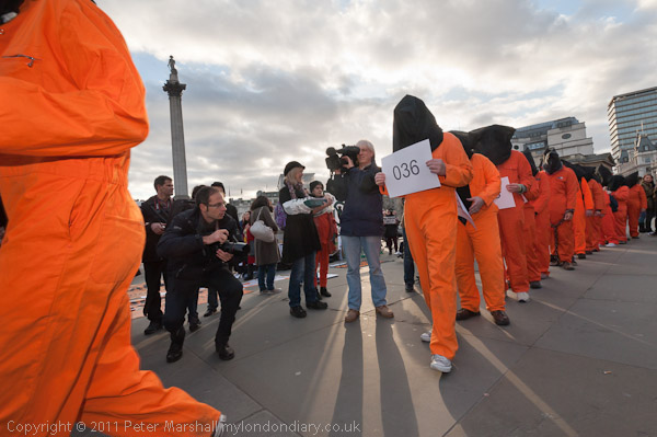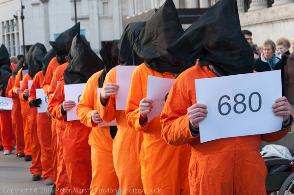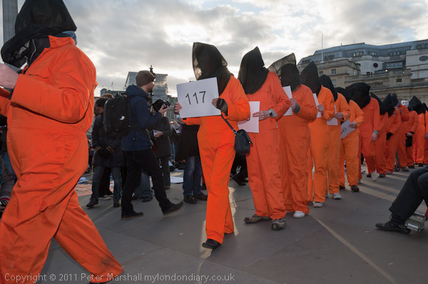 The line of 'detainees' with Guantanamo numbers, orange jumpsuits and black hoods in Trafalgar Square