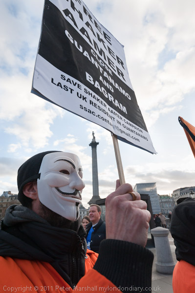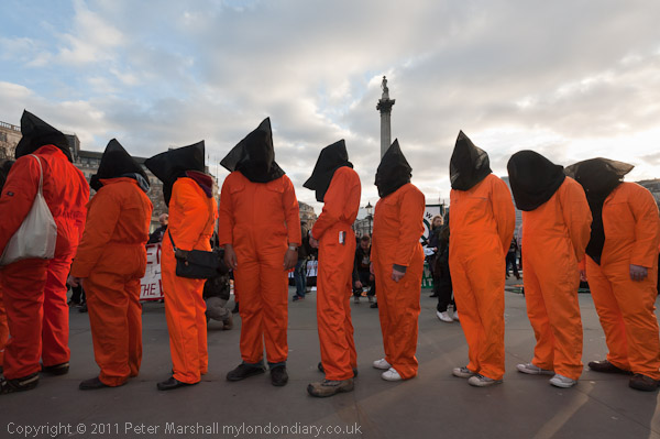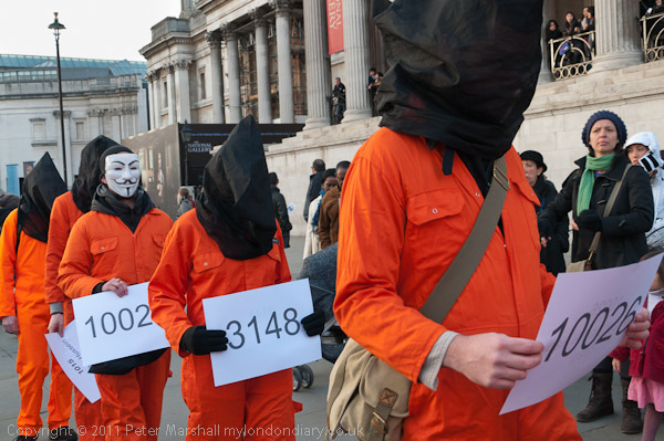Orange jump suits, black hoods and an 'Anonymous' mask