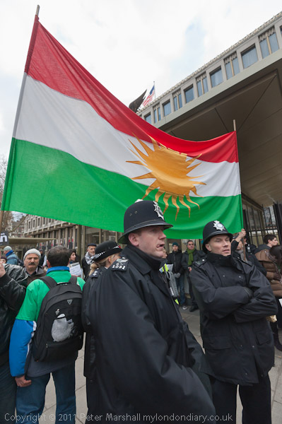 Police officers look bewildered. Behind them in front of the embassy is the Kurdistan flag