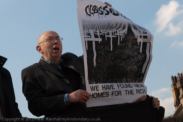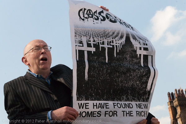 Ian Bone (right) holds up a Class War poster 'We have found New Homes For The Rich!' of a military cemetery