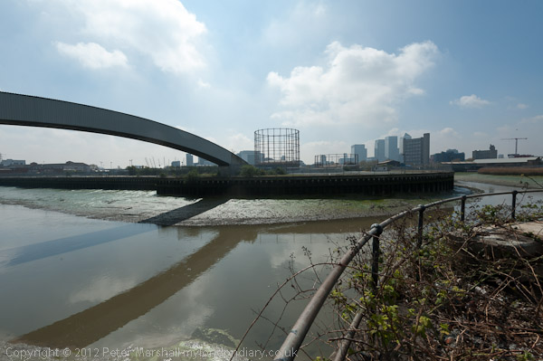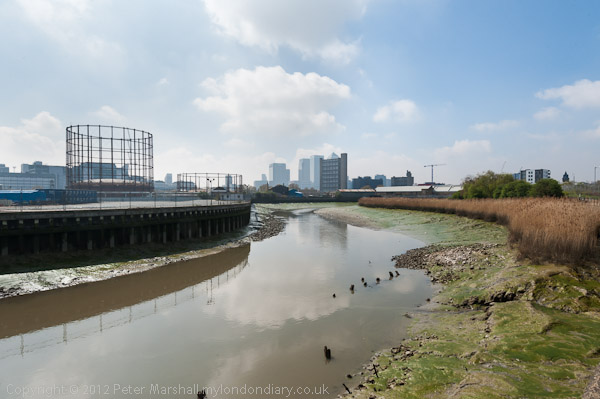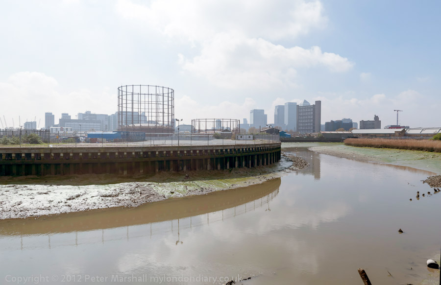 Bow Creek just outside Cody Dock, with the holders of Poplar gas works on the left and Canary Wharf in the distance behind Goldfinger's Balfron Tower