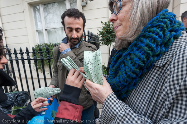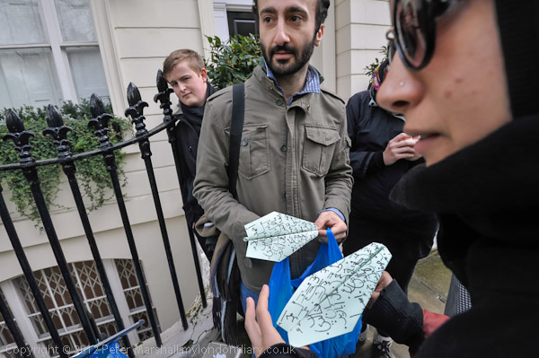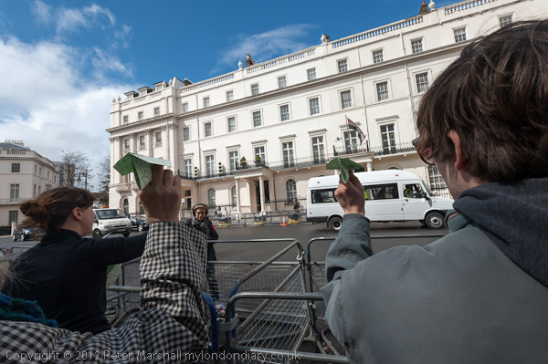 Protesters hold planes covered with the names of Syrians killed by goverment forces in recent months