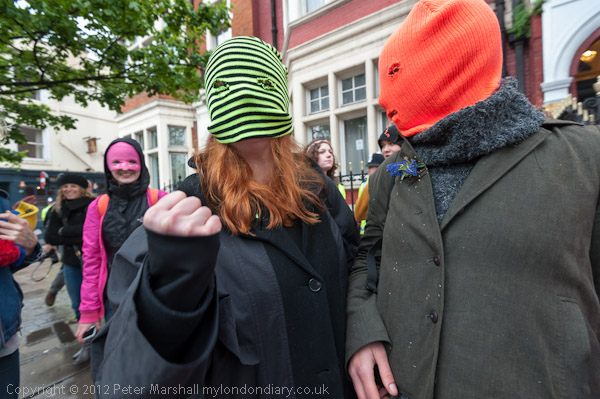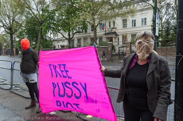 People gathered outside the Russian embassy and put on hoods like those worn by Pussy Riot