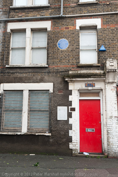 View of Guys, the Shard and the City: The blue plaque on a house on Dawes St (actually 183A East St) for Dr. Charles Vickery Drysdale (1874-1961), a founder of the Family Planning Association, who opened his first birth control clinic here in 1921.