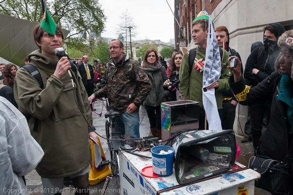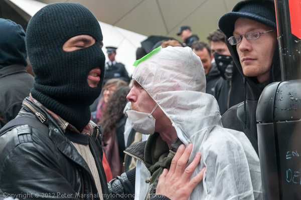 Protesters dance on the street outside the main entrance of the Grange Hotel
