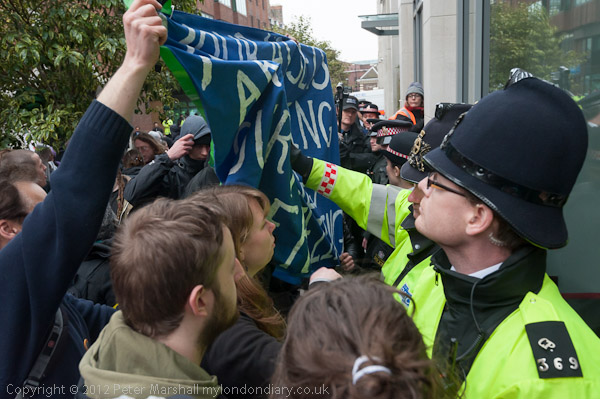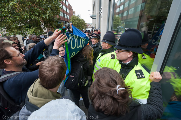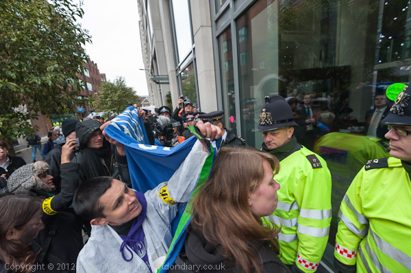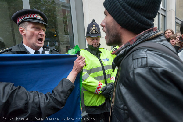 Police try to prevent people holding up a banner to the hotel window