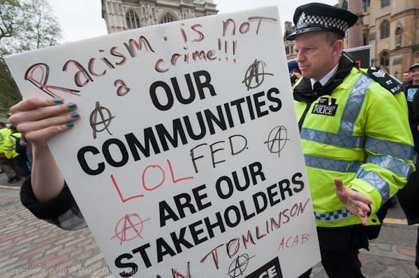 The Defend The Right To Protest group reminded police marchers of Alfie Meadows, Sean Rigg, Ian Tomlinson, Jean Charles de Menezes and others