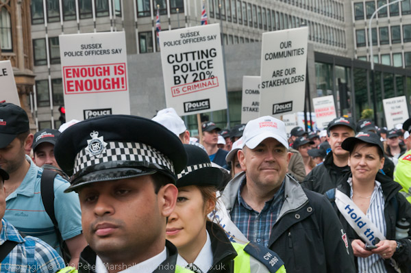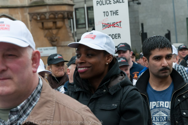 A police line in front of the 'Defend the Right To Protest' banner - another piece of intimidation
