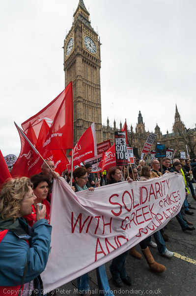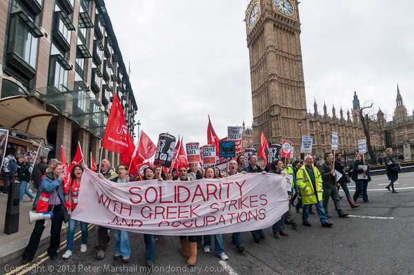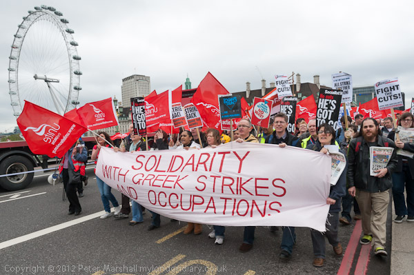 The banner at the front of the march -'Solidarity With Greek Strikers And Occupations'