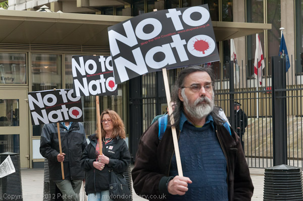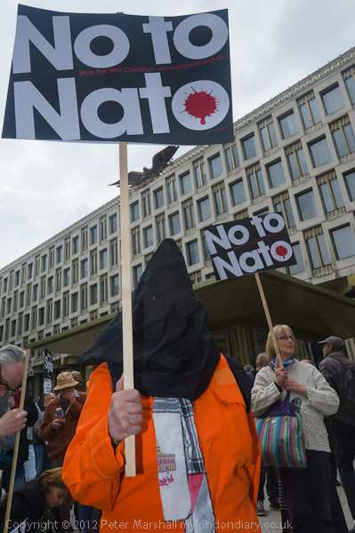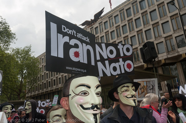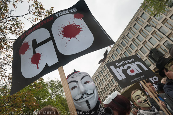 Anonymous masked suporters hold Stop The War placards at the US Embassy