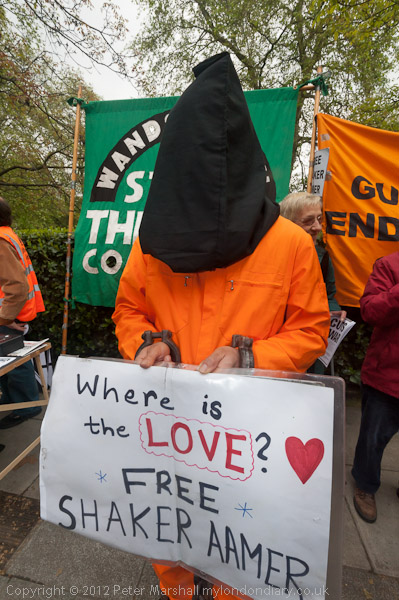 Protesters in orange jumpsuits call for the release of Shaker Aamer from Guantanamo