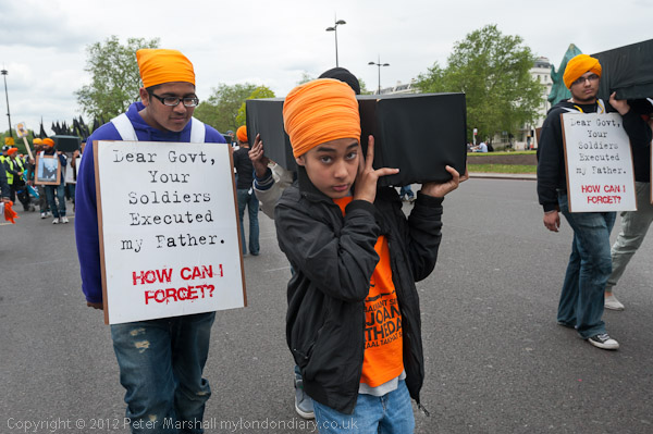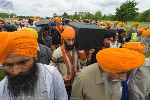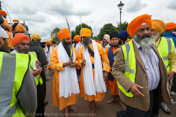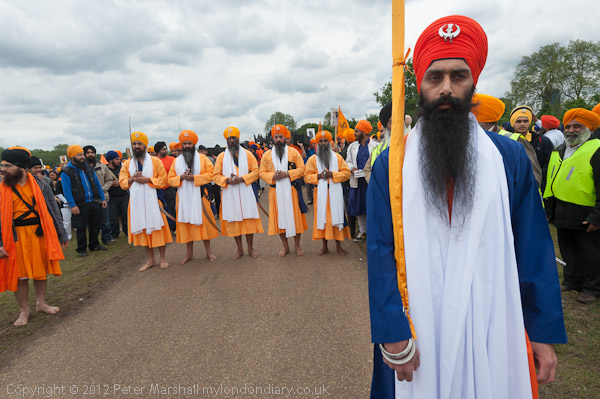 Getting ready to start marching with the Sikh flags in front of the Panj Pyare with raised swords