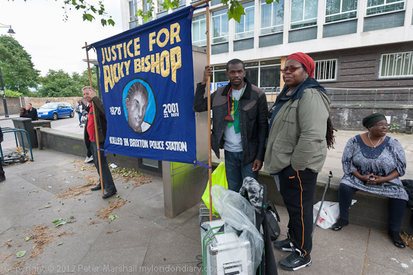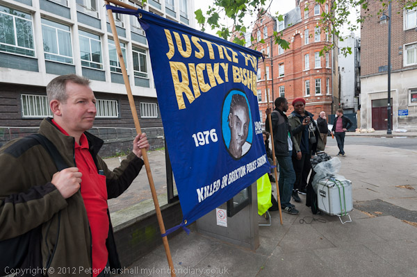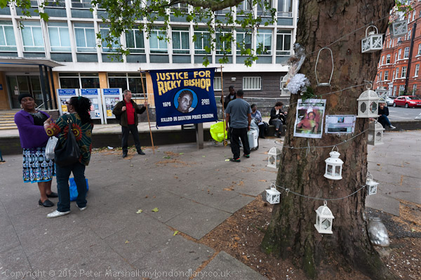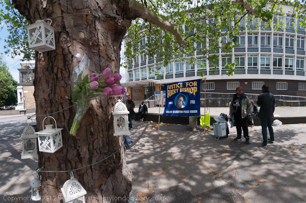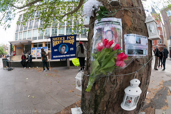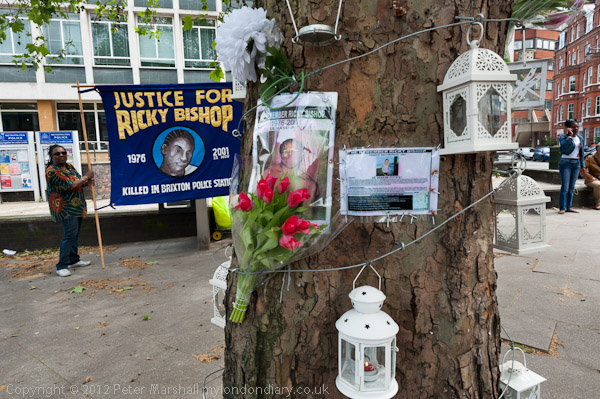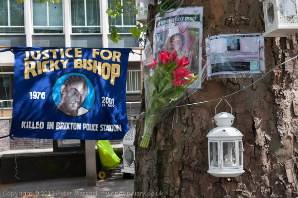 Banner, flowers, posters and candles for Ricky Bishop, killed in Brixton Police Station