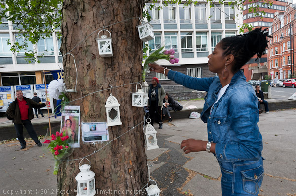 Sean Rigg's sister Marcia puat some tulips on the tree