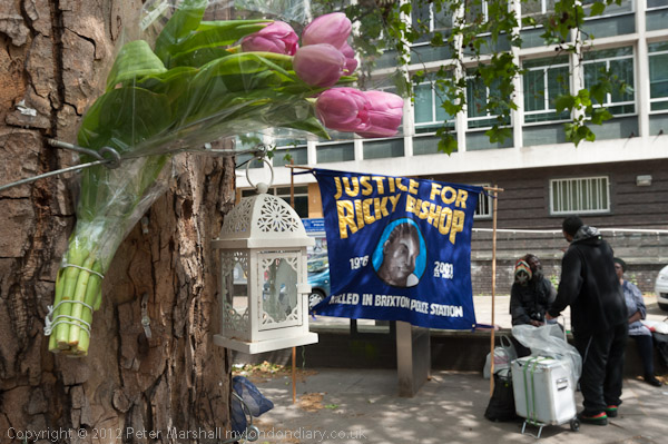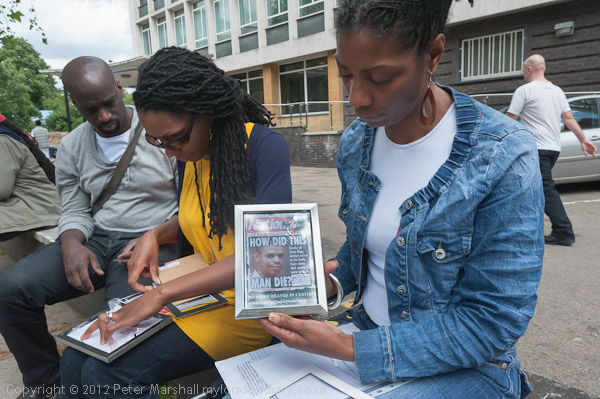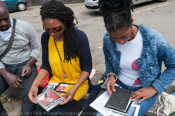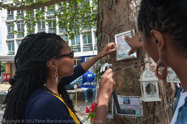 Samantha and Marcia, Sean Rigg's sisters, frame pictures of him to fix to the memorial tree