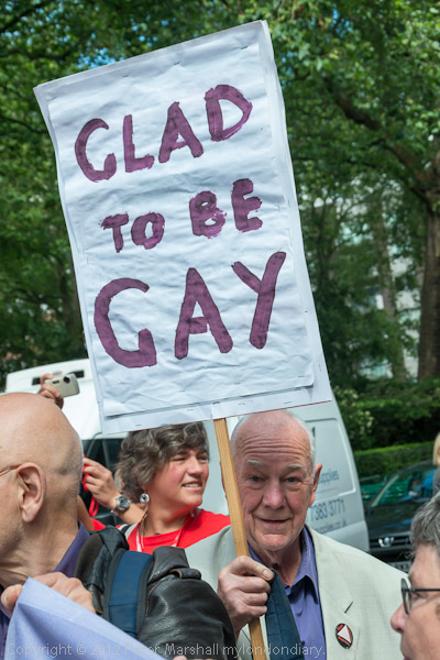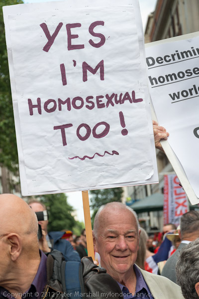 Peter Tatchell at the front of the march with a placard calling for Global LGBT Equality