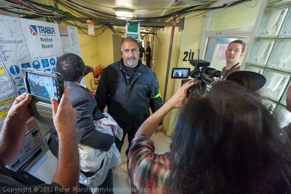 ![]() There are now two police vans, but police are unable to find a reason to prevent residents and their guests entering ![]() We are shown the BBC is occupying the lift lobby as well as the floors they have part rented ![]() and there are possible health and safety hazards for residents, particularly their children ![]() We take it in turns to go in and see the flat, which is in excellent repair (although the council say these flats are too expensive to refurbish, if UCL takes over the site it may reuse them as student residencies.) ![]() Colin's flat looks out over the Carpenters estate. We also have an invitation to visit Warren on the 20th floor. BBC Security say we can't go up there. We take the lift up and at first they stop us leaving the packed lift |