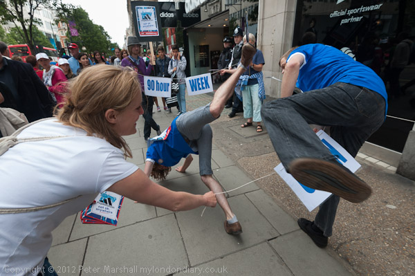 War on Want handed out leaflets and played games outside Adidas on Oxford St, claiming that workers making clothes for the official sportswear partner of London 2012 get poverty wages are not allowed to form unions and have little or no job security.