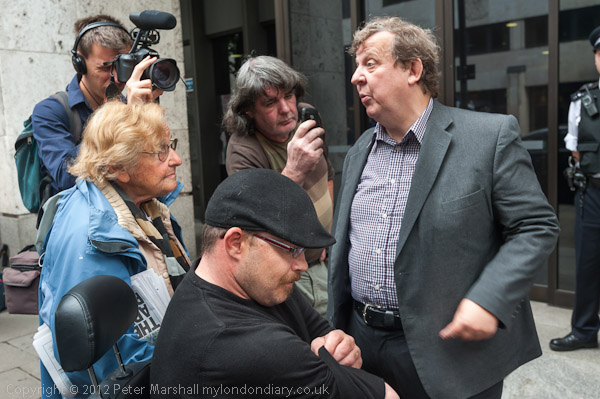 Disabled activists occupied the Department of Work & Pensions and protesters from the 'Closing Atos Ceremony' came to Westminster to join them outside the offices. Outside, DPAC activist Adam Lotun announced his intention to stand in the Corby by-election.