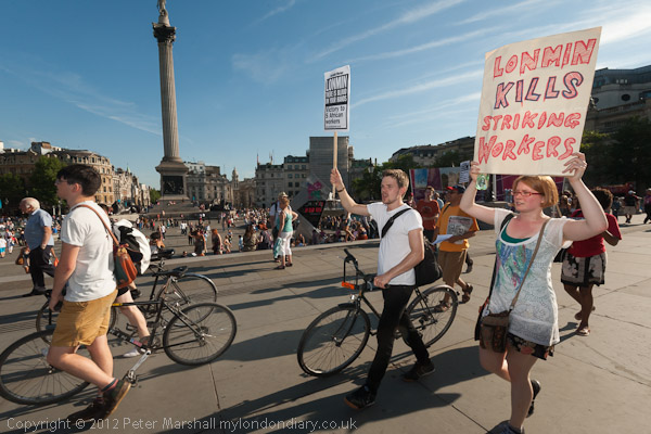 The stage blood was a little street theatre in a peaceful protest against the mining company whose activities have been condemned by Amnesty International, and have led to disinvestment by concerned investors including the Norwegian Government Pension Fund, Martin Currie Investments, the Church of England, the Joseph Rowntree Charitable Trust and the Dutch Pension Fund PGGM, but they are still backed by more than 30 major banks and financial agencies including HSBC, RBS, Deutsche Bank, Axa, Royal Bank of Canada, Credit Suisse, J P Morgan Chase, Goldman Sachs, Lloyds Banking Group, Nordea Bank, ICICI, Citigroup, National Bank of Kuwait, ANZ and Merrill Lynch.