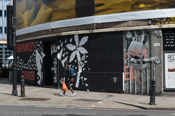 I was rushing to catch my train home when I thought this might be an interesting picture, though very tricky to get it lined up exactly. But as much as anything I was amused by the copyright problems it might embody. I only took the one frame, but perhaps another day when I have more time I might retake it more precisely, although it looked more or less right in the viewfinder - where the image is just a little small for this kind of thing.