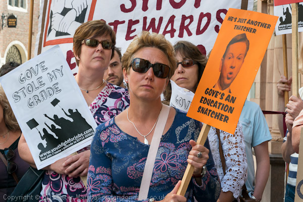 The urgent protest was called at the last minute by London teachers, who as well as being appalled by the unfairness of the changes on their students are also worried that the lower results will mean that many schools now fail to reach the 40% A-C benchmark imposed by Education minister Michael Gove, and will be forcibly privatised. Individual teachers may also face 'capability' proceedings and loss of performance-based pay awards as a result of the lower results, even though the actual performance of students has not changed.