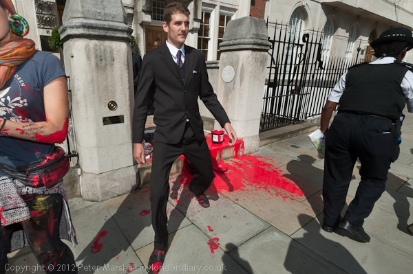 I was busy a few yards away and missed seeing the actual throwing of the fake blood, but several protesters went to dip their hands in it and were chased away by security and the one police officer who was then on duty at the event. I think the person who had thrown the blood quickly left the area.