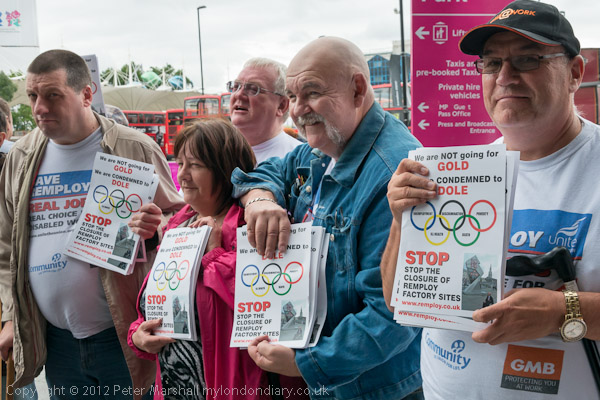 On the opening day of the Paralympic Games, Remploy workers and supporters protested outside Stratford Station following the closure of 27 Remploy factories last week. Few of the disabled workers who lost their jobs will ever work again.