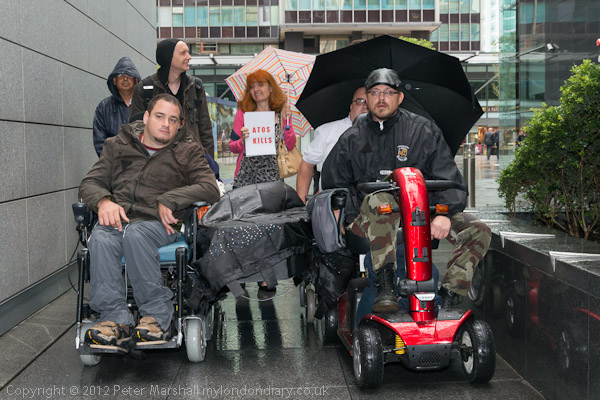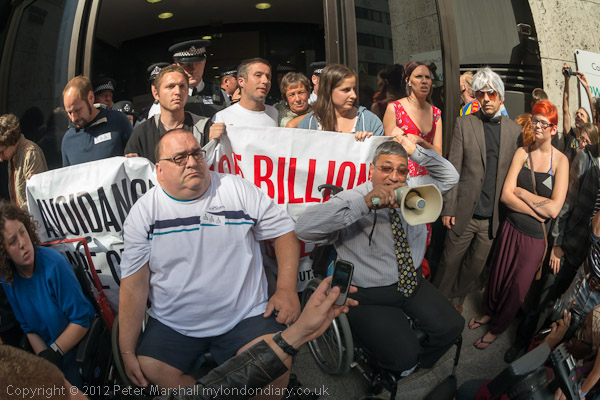 Over 50 people, including many in wheelchairs arrived to take part in the protest, which began with a several speeches about the problems caused by Atos assessments which led to this action, as well as mentioning other unsuitable Olympic sponsors such as Dow, still failing to take up their responsibility for the Bhopal disaster, and the scandal of disabled prisoner Daniel Roque Hall, now in intensive care after the failure of Wormwood Scrubs to provide the necessary medical facilities for him.