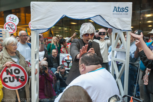 There were a couple of pieces of theatre at the event, and the second starred the 'Atos Miracle Cure', and archway through which those disabled people who truly wanted to be freed of their disabilities were urged by 'Atos's own Reverend' to come forward and go through the arch, which a number, mainly in wheelchairs, did. Nothing seemed to happen to them, and they were disappointed, even after the 'Rev' had blessed them and patted them on the head, but then an 'Atos doctor' in a white coat came to assess them, and lo! she gave them each a certificate that they were now fit to work, and, even more miraculous, a job. But unfortuntely the whole thing was a con!
