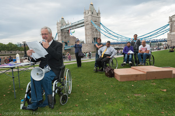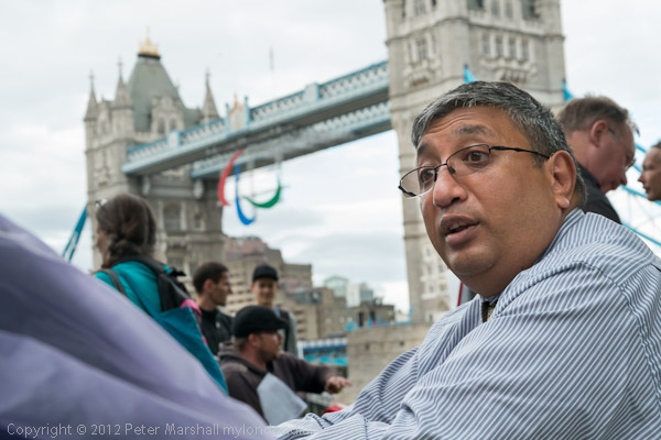 Disablement activist Adam Lotun and the Paralympic symbol hanging from Tower Bridge