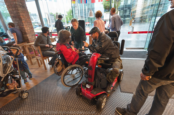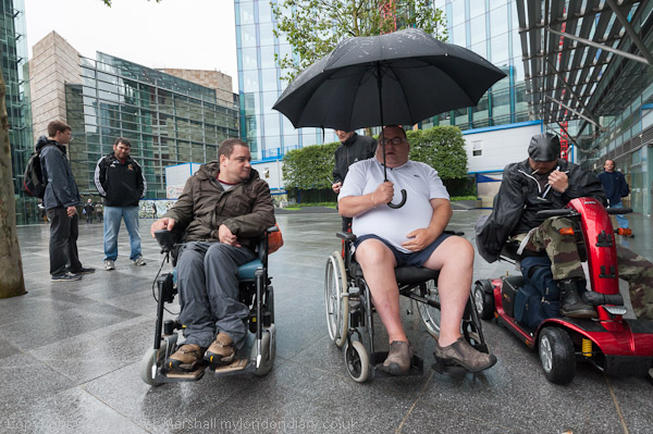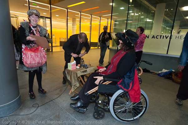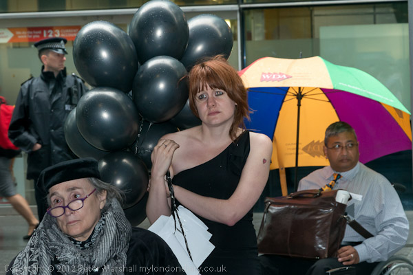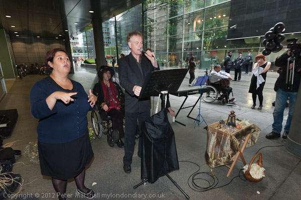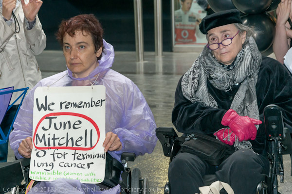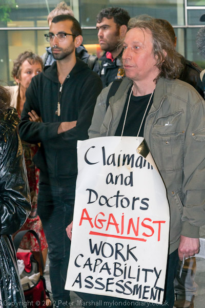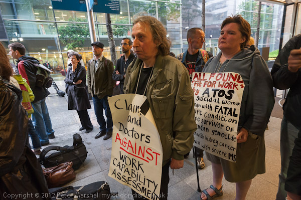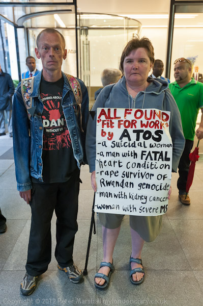 A placard lists some of the ridiculous cases were Atos tests found disabled people fit for work