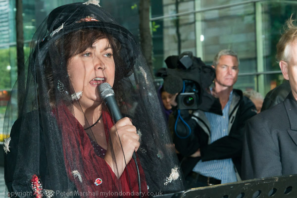 Claire Glasman of Winvisible with a poster about June Mitchell, found fit to work when dying from lung cancer