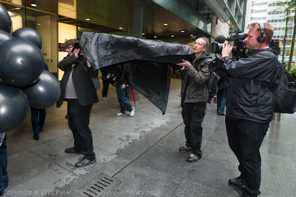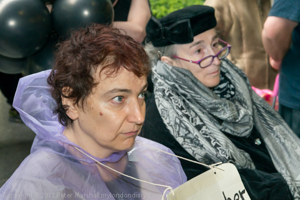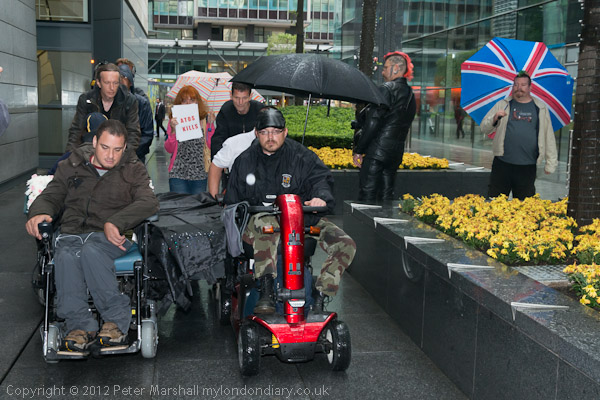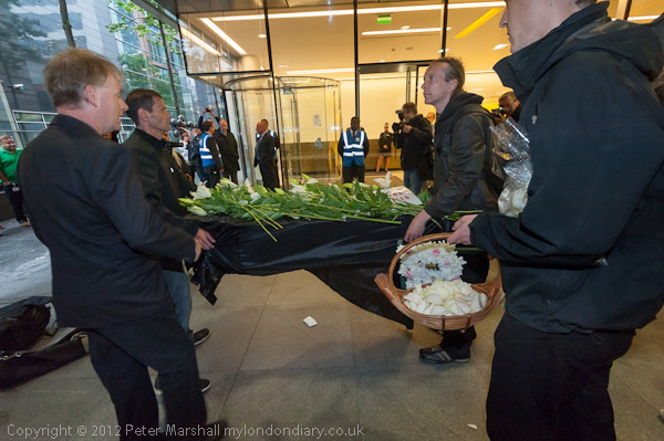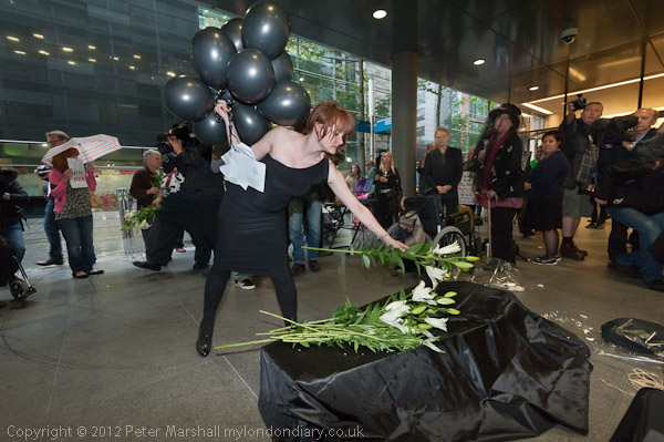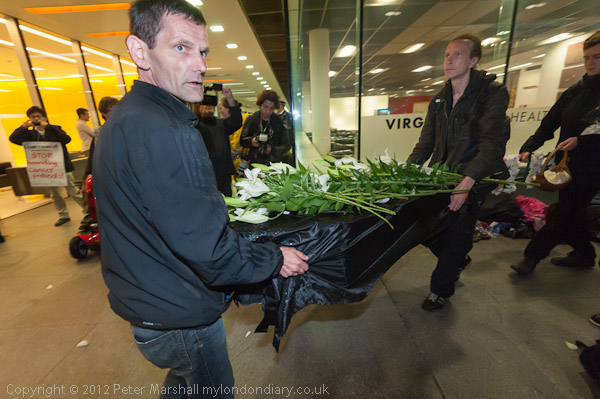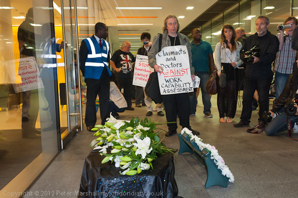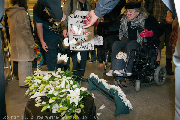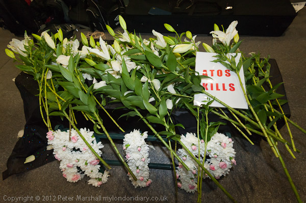 A coffin and wreath are brough up by four people on wheels with a woman carrying a placard 'Atos Kills'