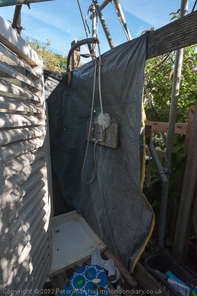 The shower uses a radiator heated by a wood fire to heat the water. They also have a hot water tap elsewhere